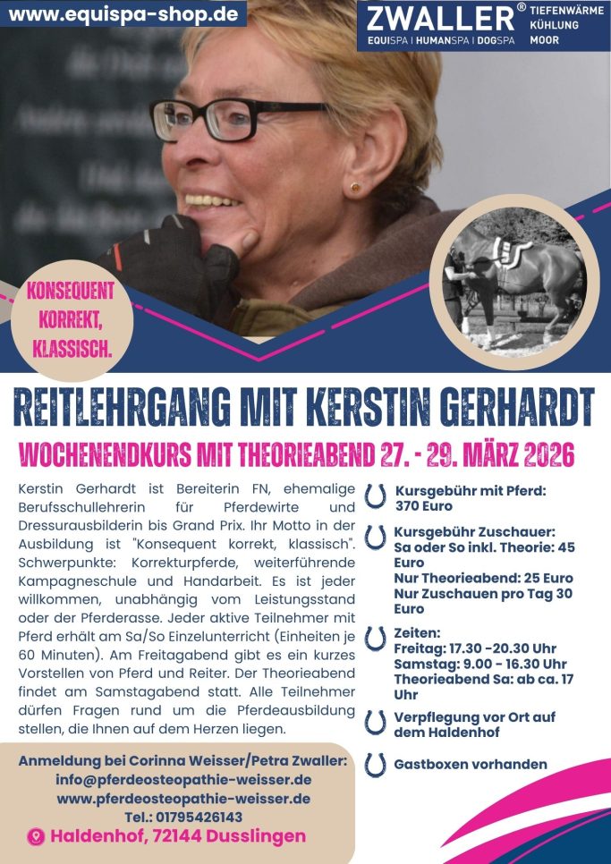- 27-29.3.26 Reitlehrgang mit Grand Prix-Ausbilderin Kerstin Gerhardt Ort: Haldenhof Dusslingen/Tübingen Petra Zwaller Equispa