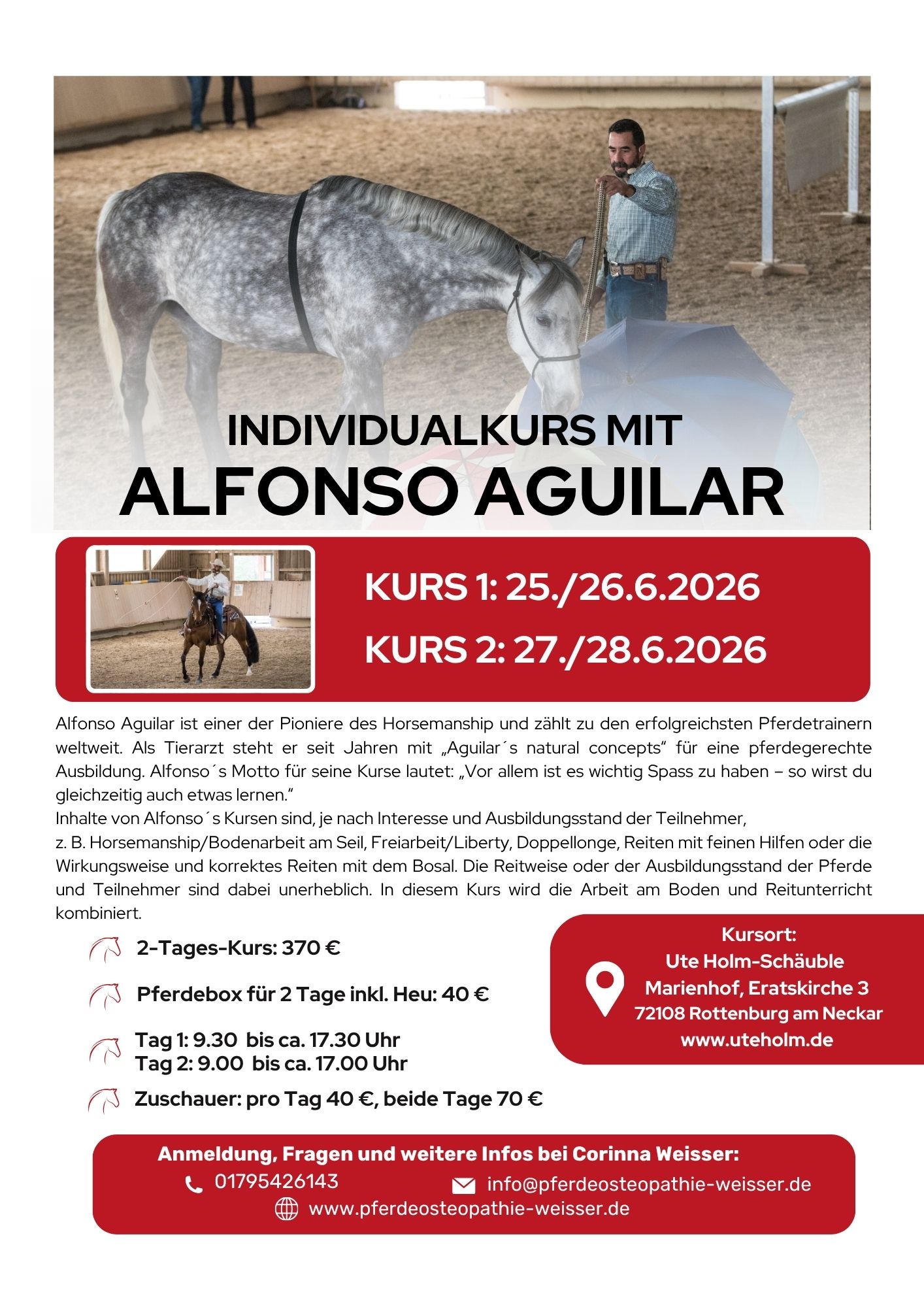 - 25./26.6.26 und 27/28.6.26 Individualkurs mit Alfonso Aguilar Ort: Marienhof Ute Holm-Schäuble Rottenburg am Neckar